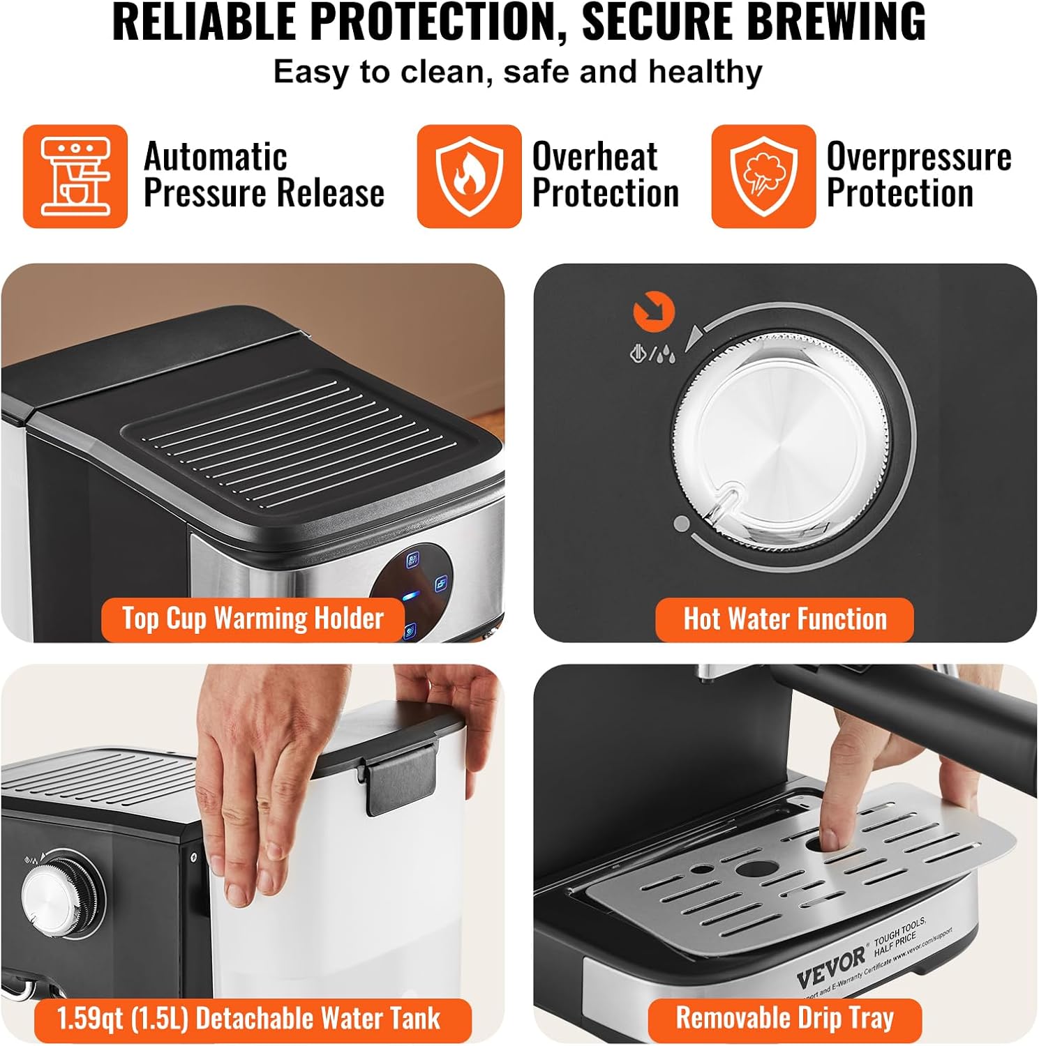 - Diseños seguros y cuidadosos: la alta seguridad se prioriza con nuestra protección automática de liberación de presión, sobrecalentamiento y sobrepresión. El tanque de agua desmontable de gran capacidad de 1.59 cuartos de galón / 1.5 litros te ahorra la necesidad de recargas frecuentes; el soporte de calentamiento superior precalienta tazas y vasos, mientras que la bandeja de goteo de agua desmontable hace que la limpieza sea fácil.